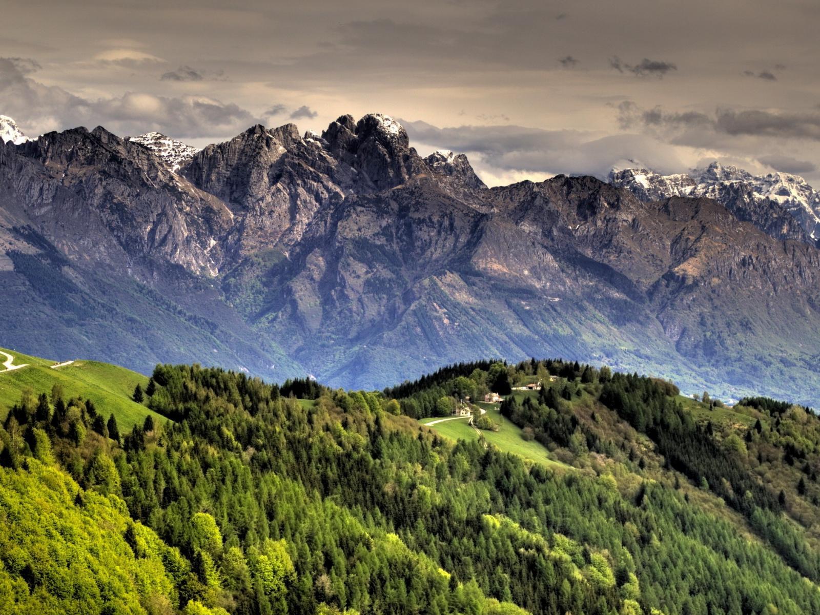 Обои Горный пейзаж с дорогой и лесом