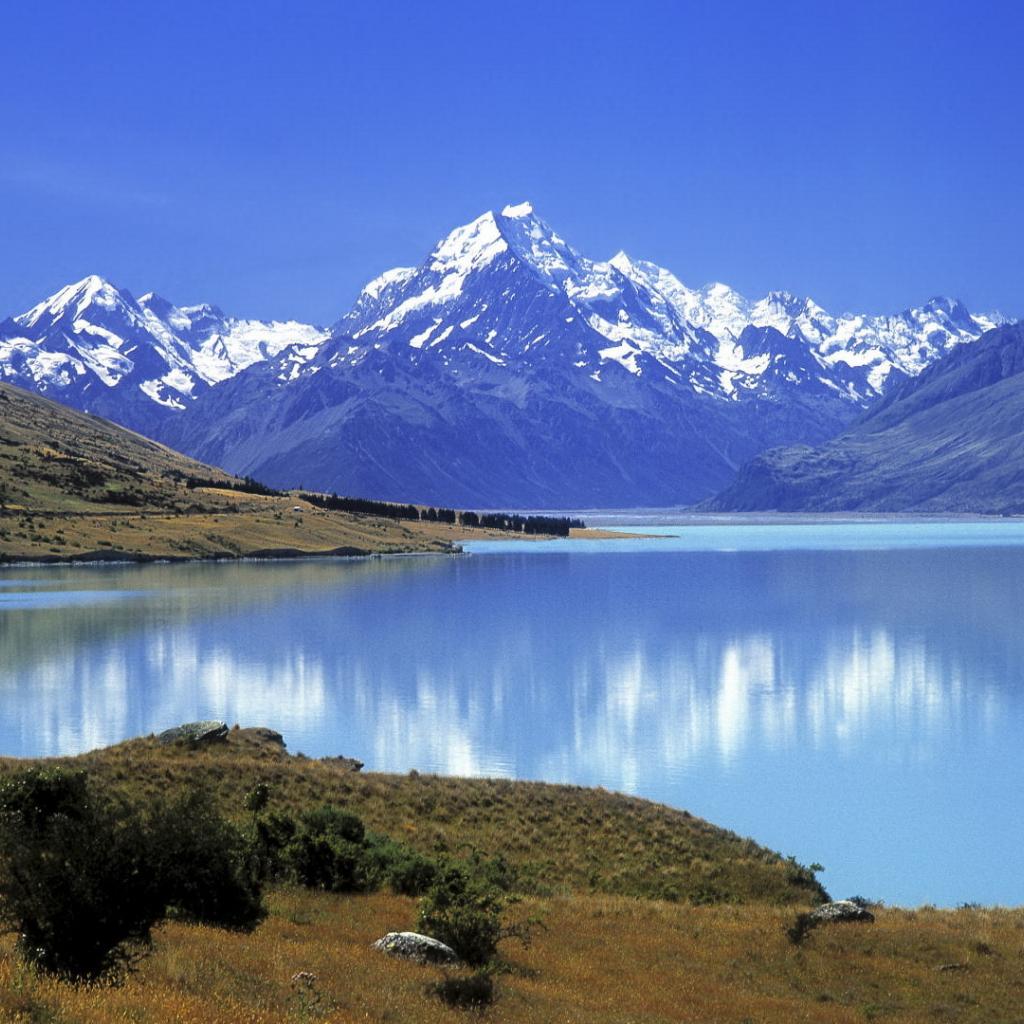 Обои Озеро, Заснеженные горы, Зеленая трава, Отражение