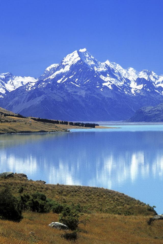 Обои Озеро, Заснеженные горы, Зеленая трава, Отражение