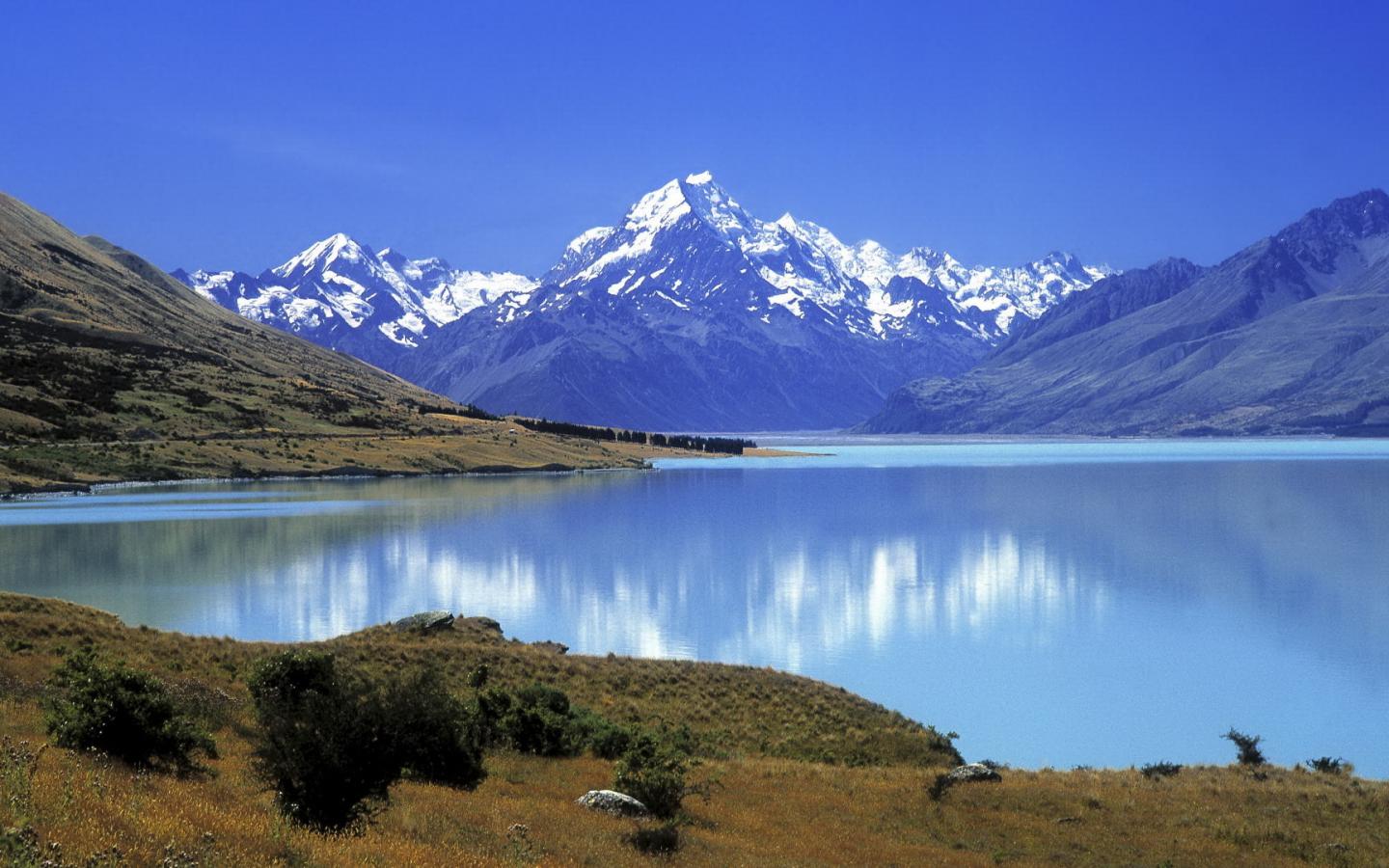 Обои Озеро, Заснеженные горы, Зеленая трава, Отражение