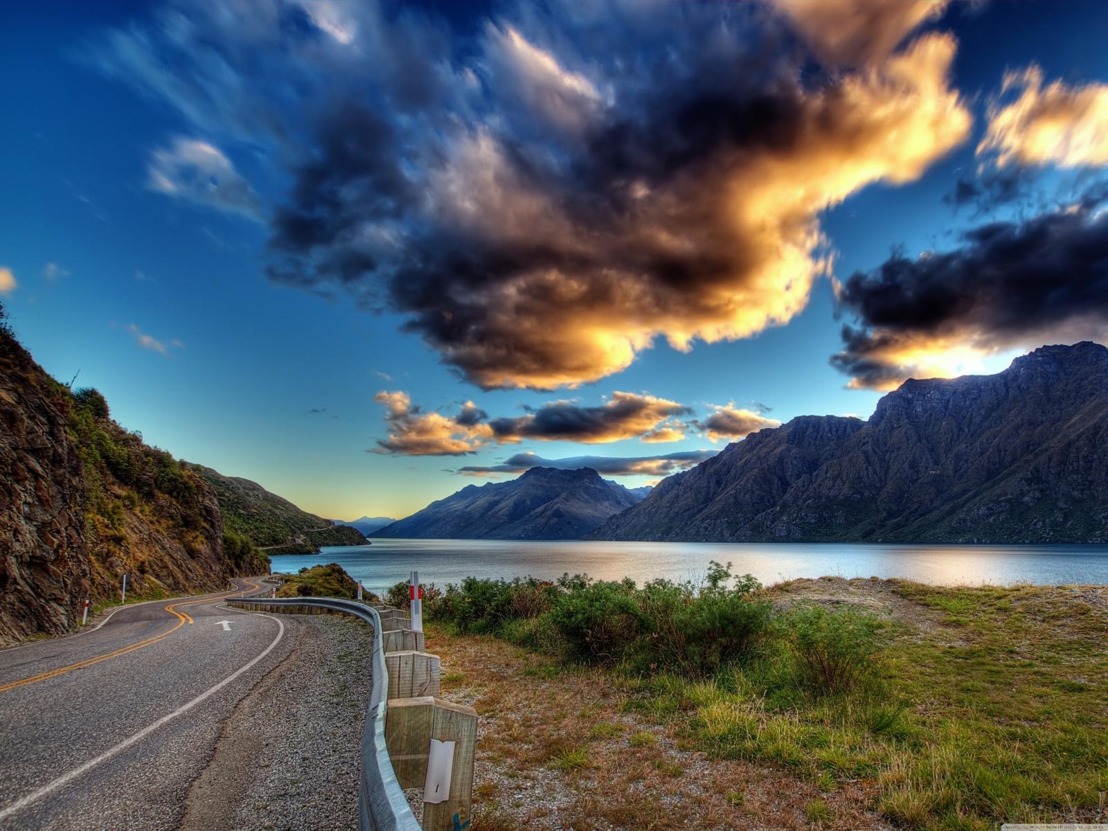 Обои Дорога, Озеро, Горное озеро, Низкие облака