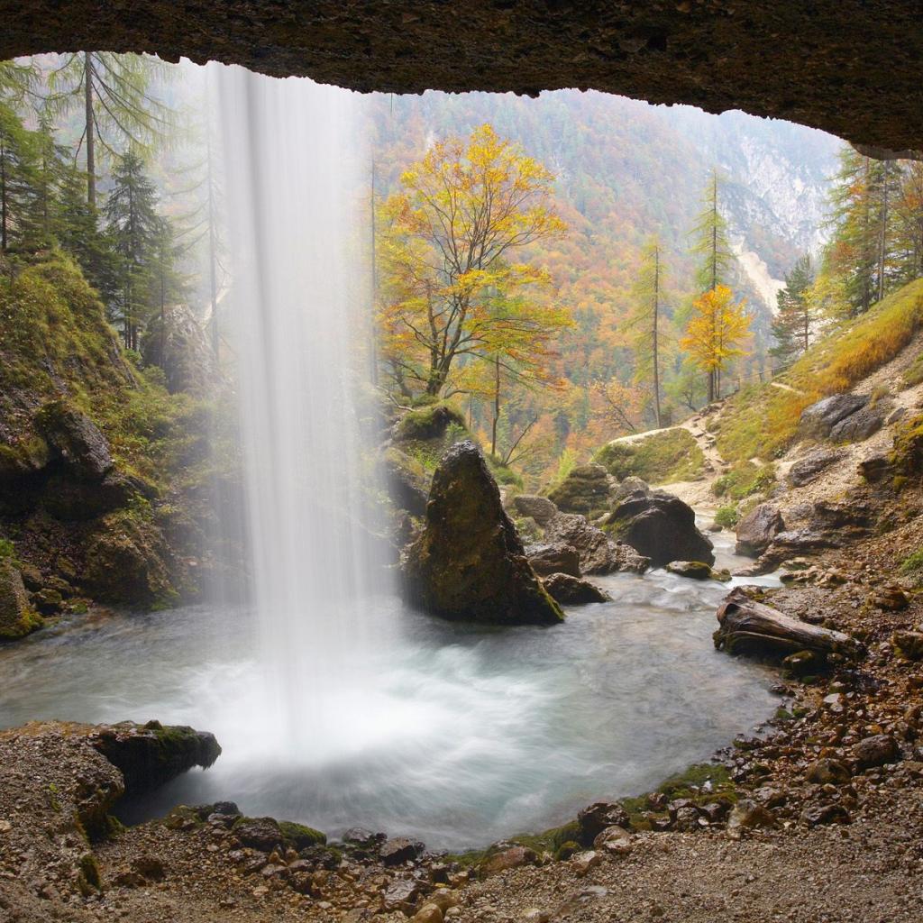 Обои Вид на водопад из пещеры