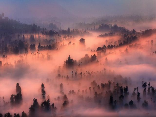 Обои Густой туман в лесу подсвечен солнцем на закате