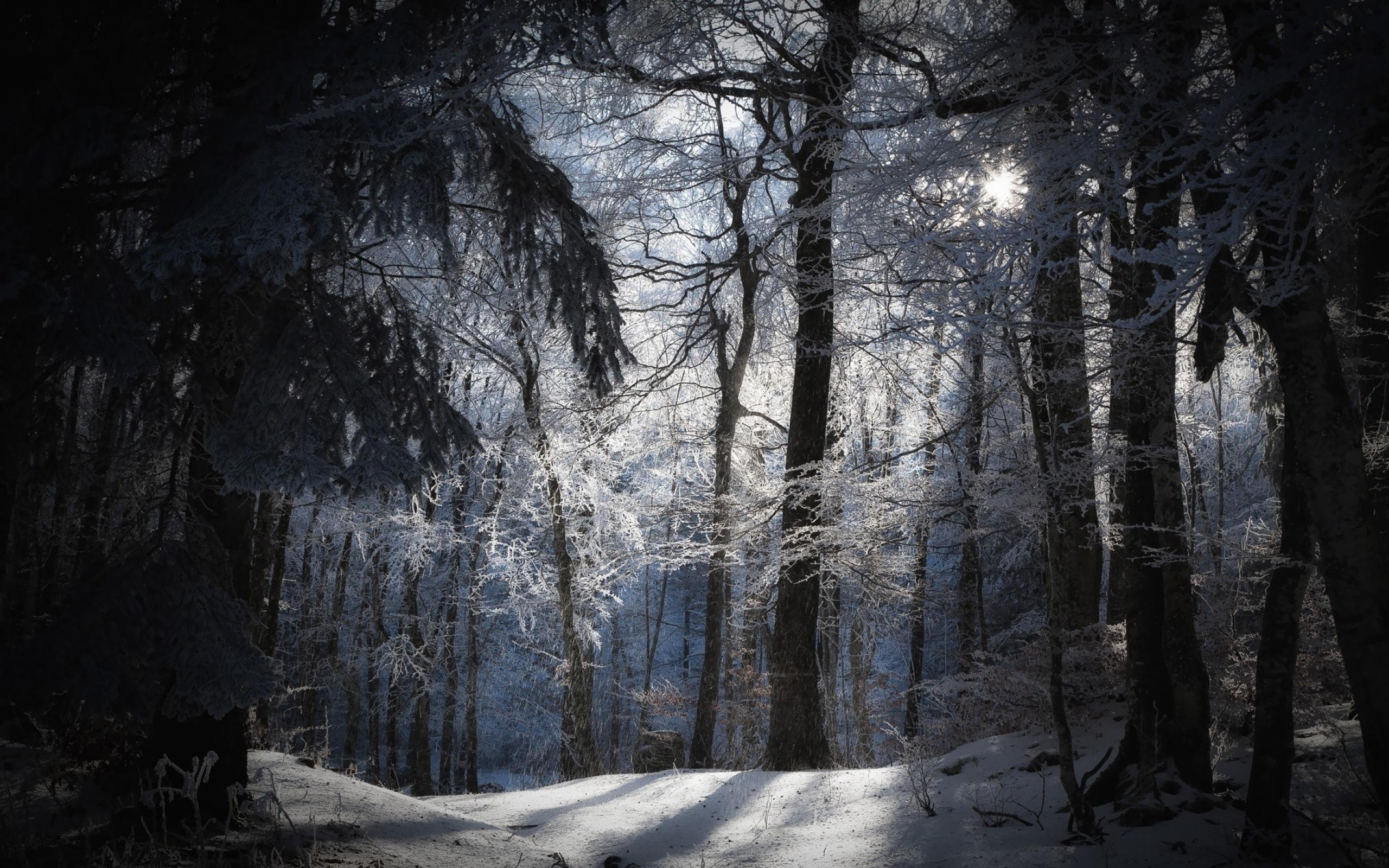 Обои Лучи солнца в заснеженном лесу