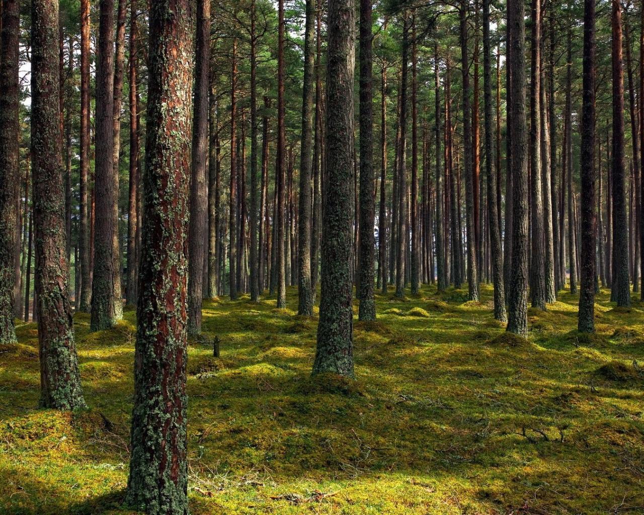 Обои Покрытые лишайником стволы деревьев