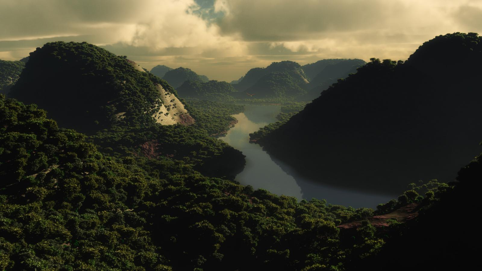 Обои Река вдоль лесных холмов