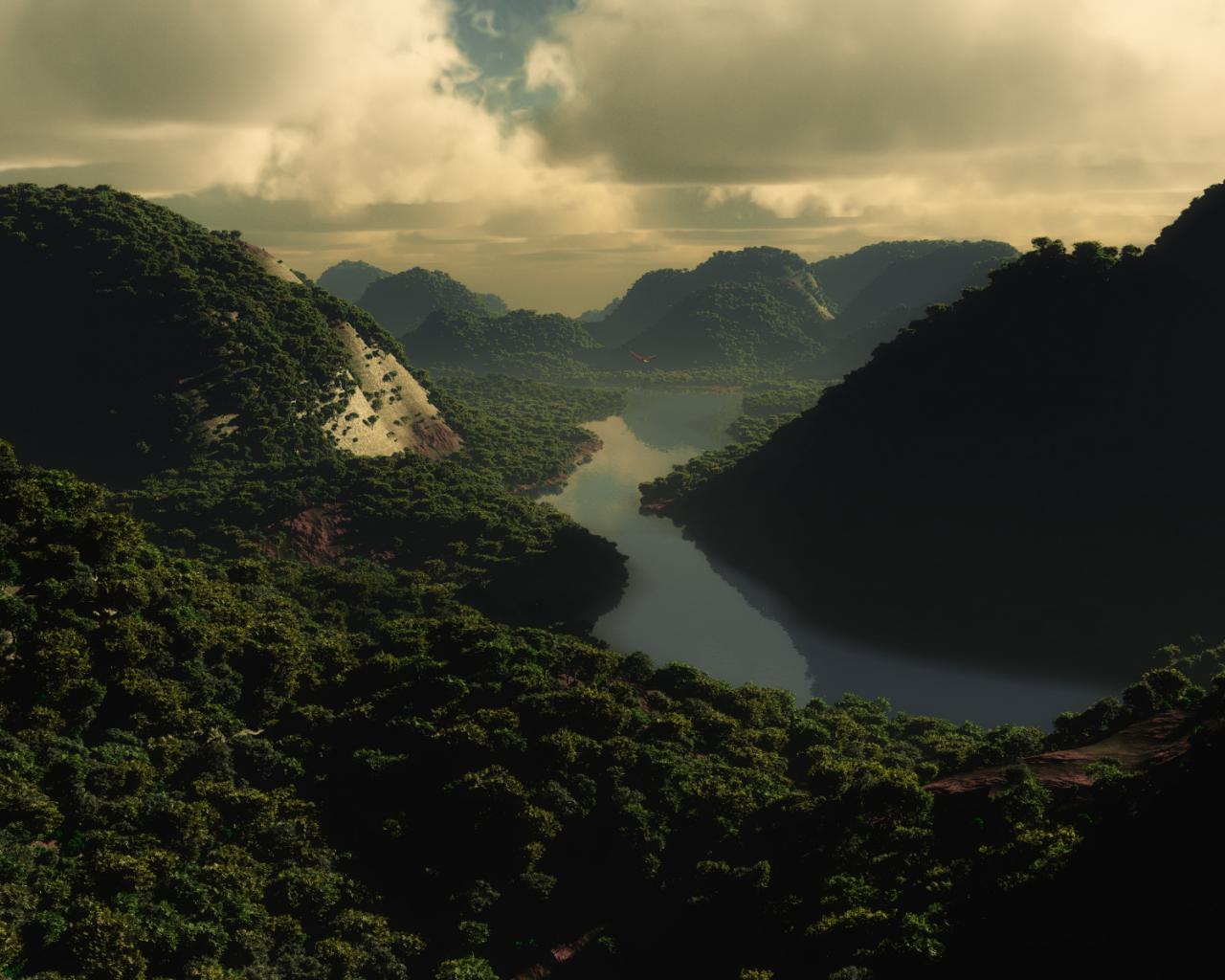 Обои Река вдоль лесных холмов