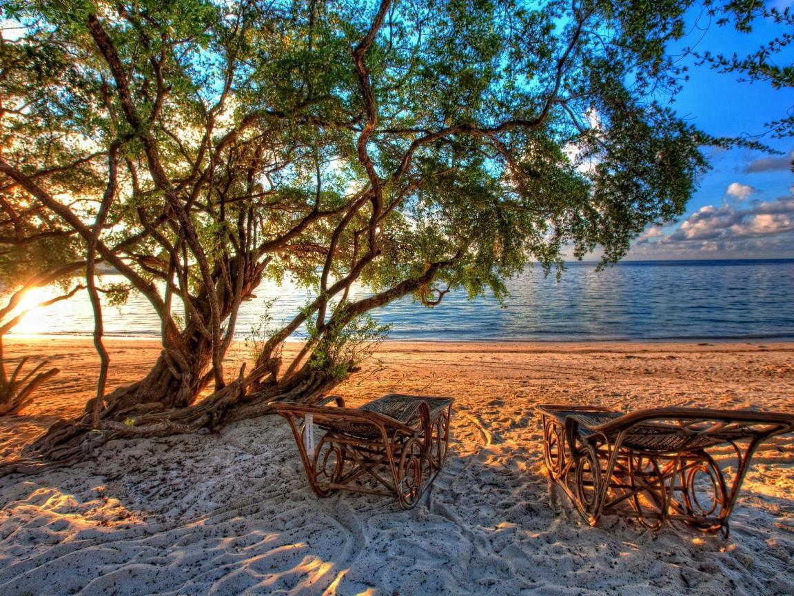Обои Шезлонги из лозы на пляже под деревом