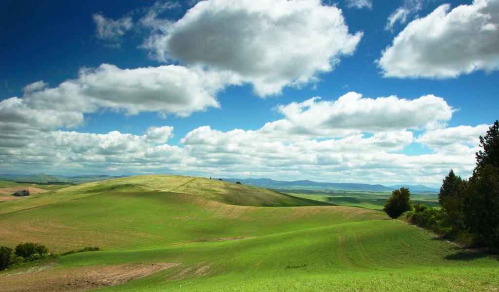Обои Облака над холмистыми полями