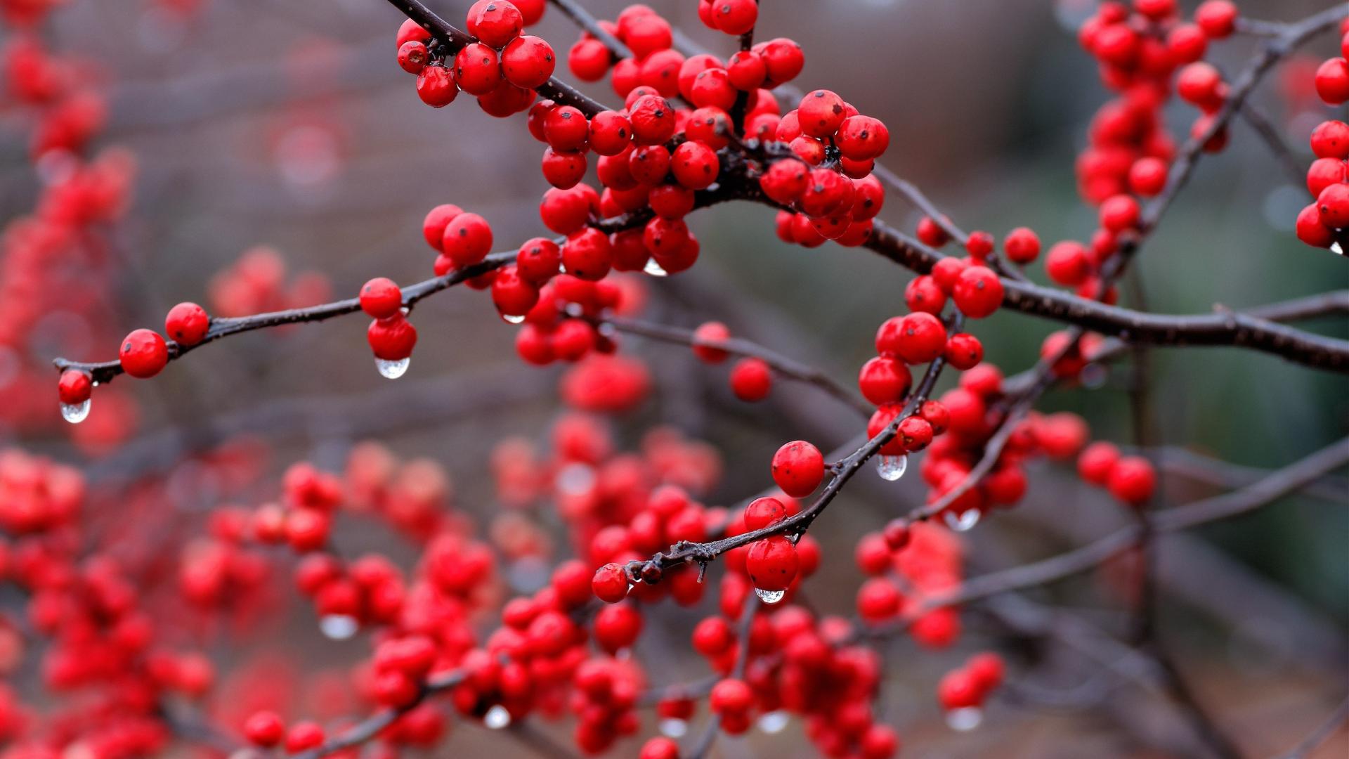 Обои Капли дождя на ягодах калины