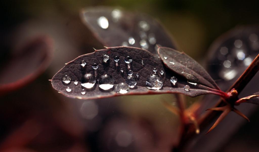 Обои Капли влаги на черных листьях