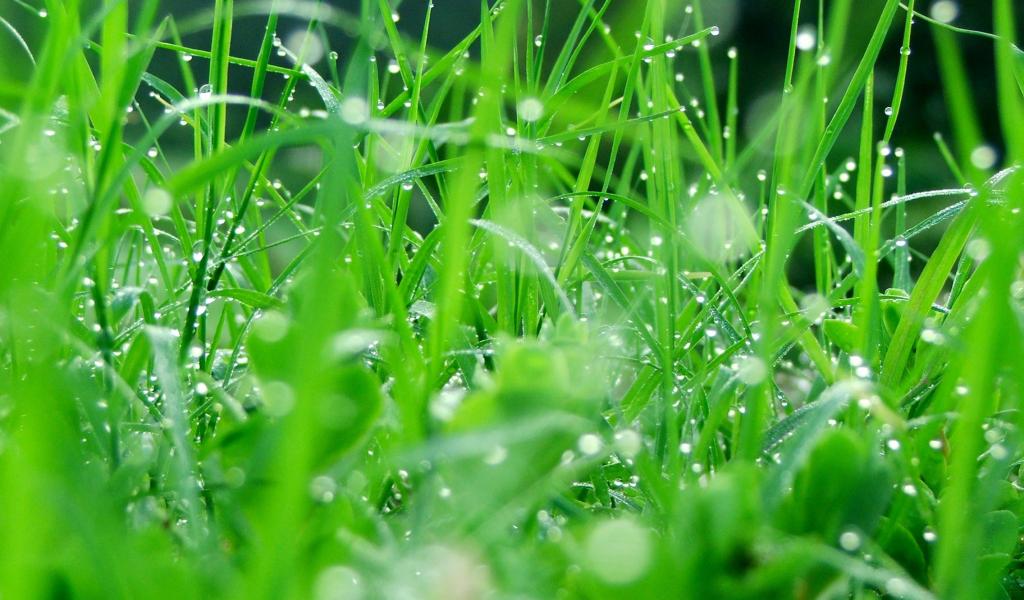 Обои Капли, Зеленая трава, Утро, Макро