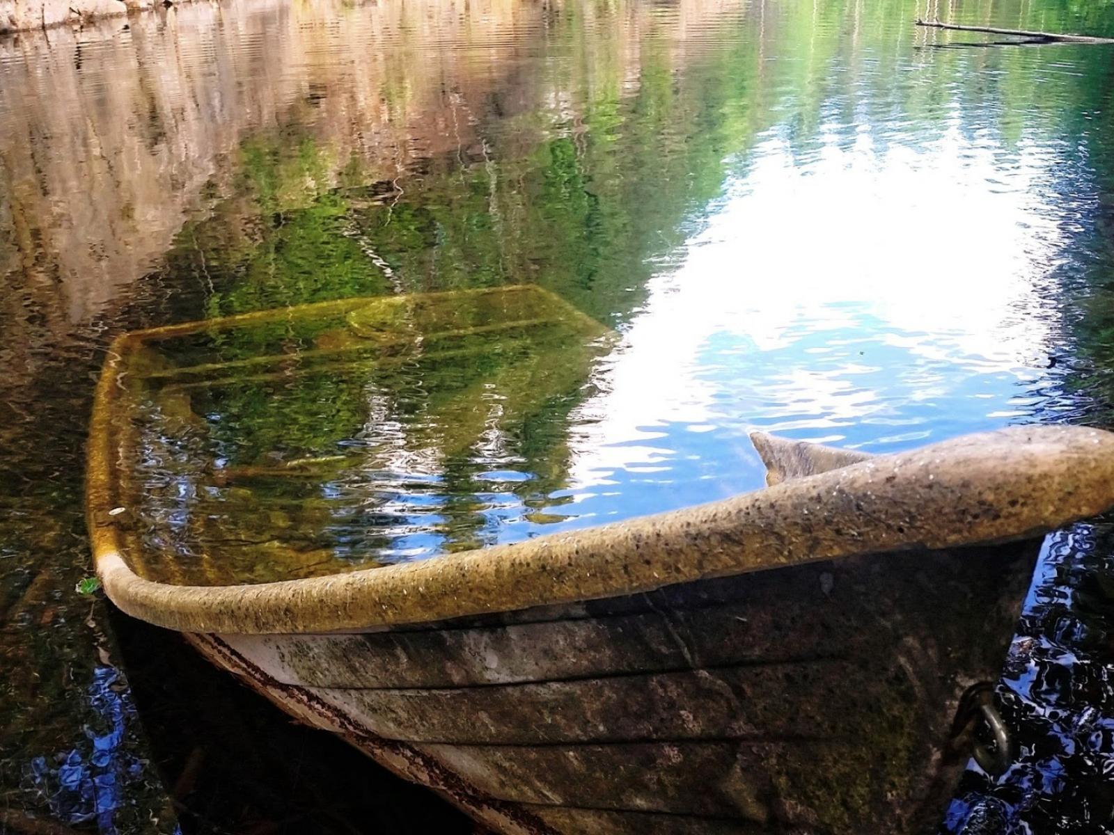 Обои Заброшенная лодка затоплена у берега озера