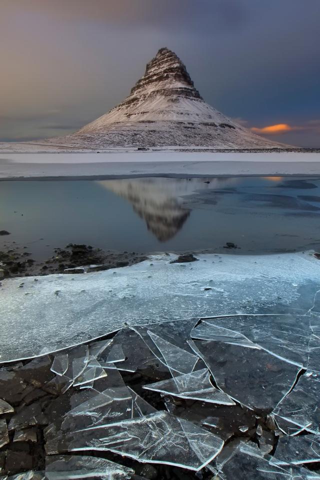 Обои Тонкий лед озера на фоне горы