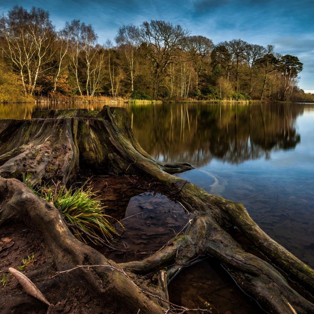 Обои Пенек и корни дерева на краю озера
