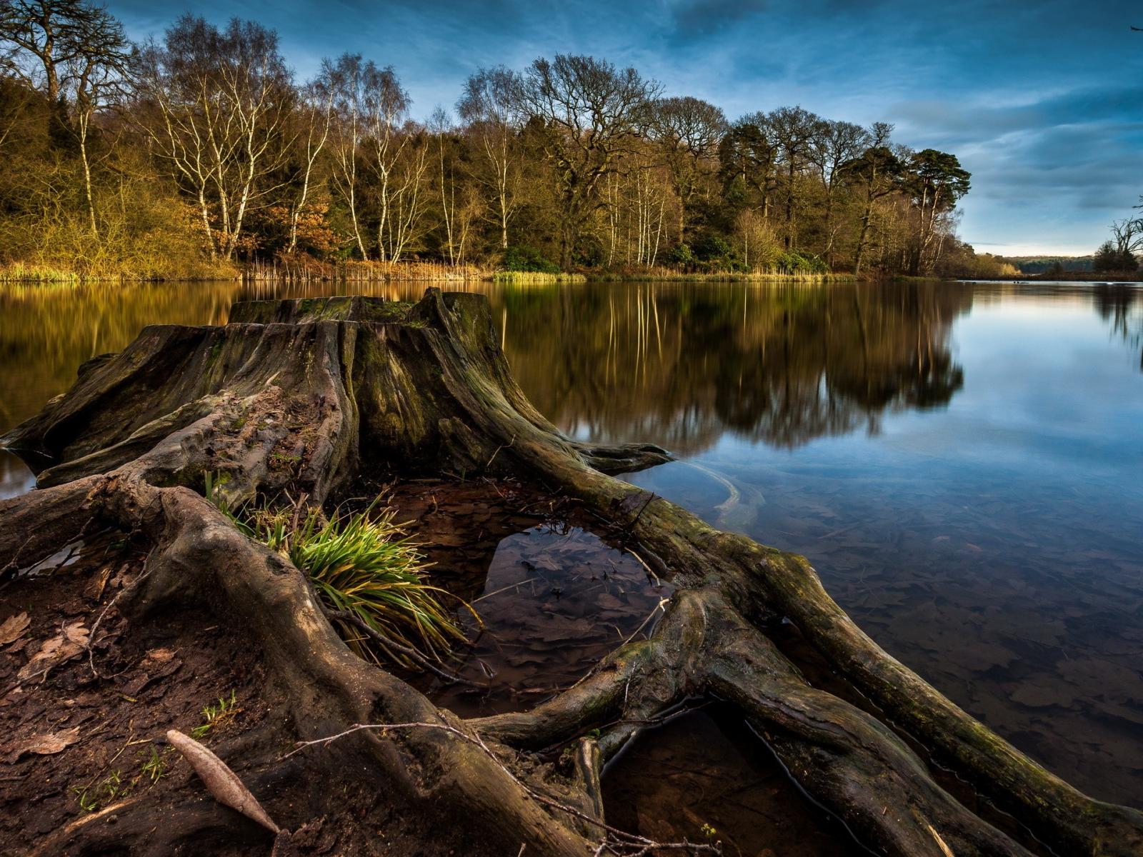 Обои Пенек и корни дерева на краю озера