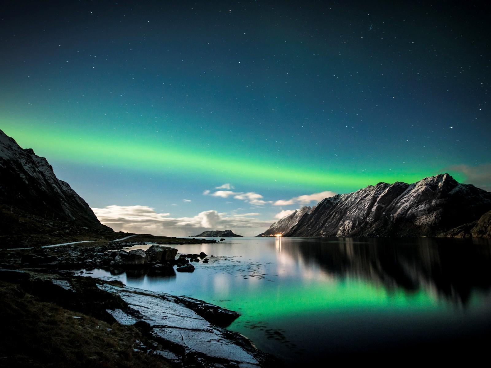 Обои Зеленое северное сияние над озером