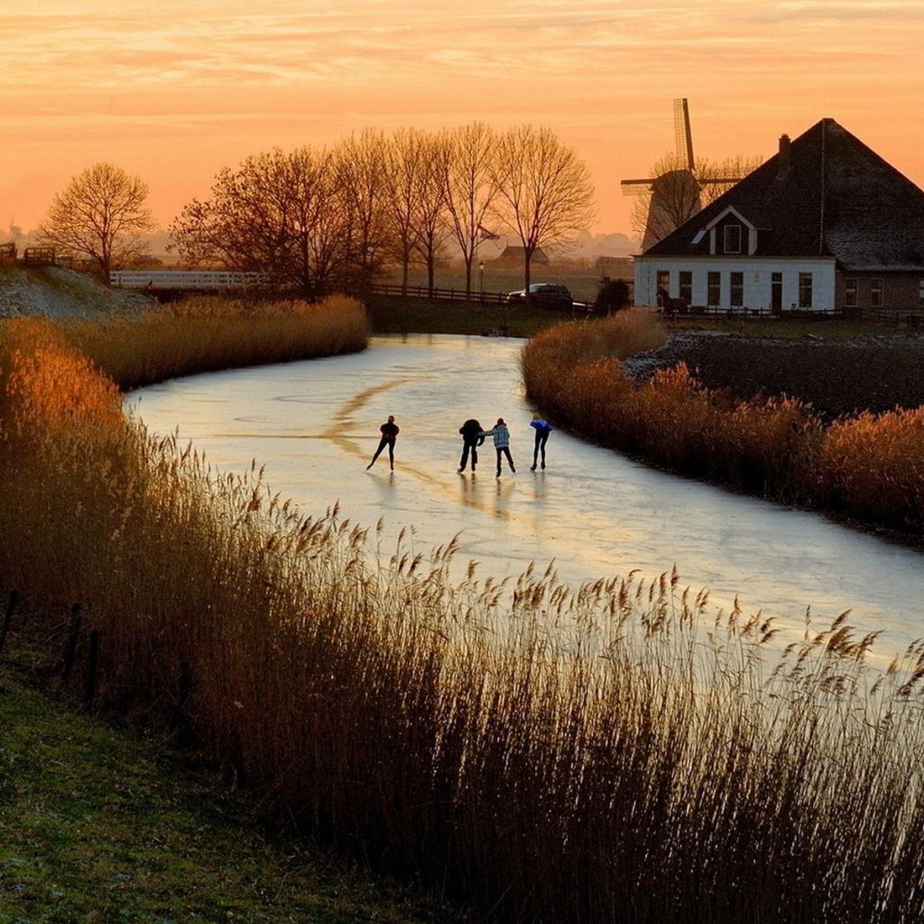 Обои Дети катаются на коньках по замерзшей реке в Нидерландах
