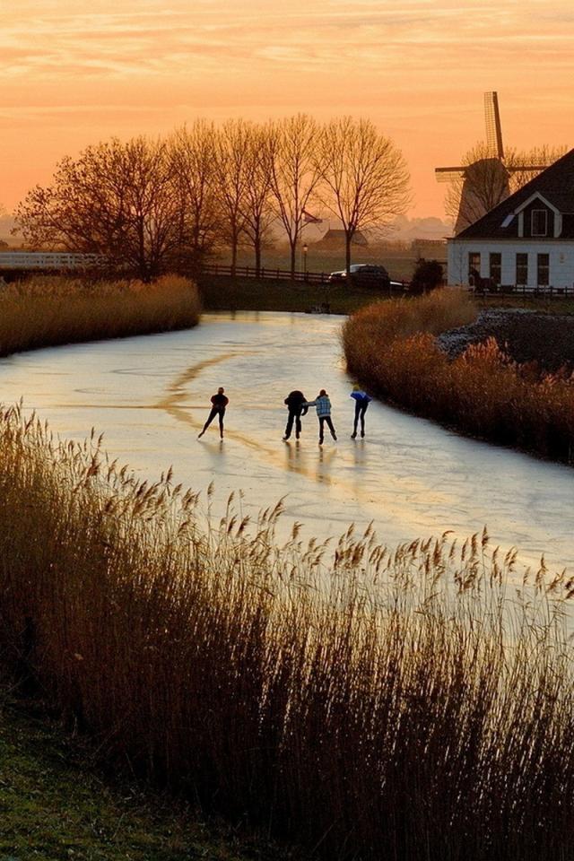 Обои Дети катаются на коньках по замерзшей реке в Нидерландах