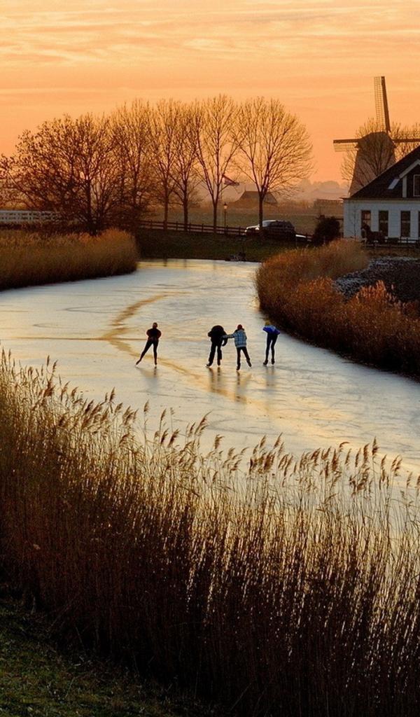 Обои Дети катаются на коньках по замерзшей реке в Нидерландах