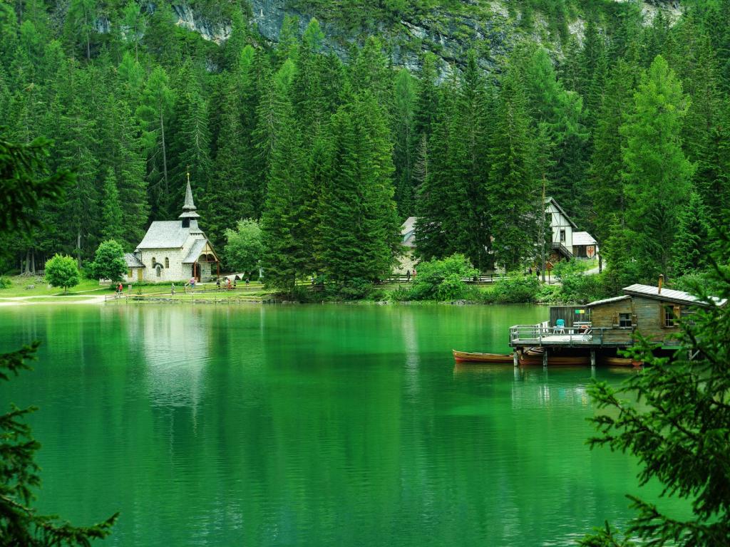 Обои Хвойные деревья вокруг зеленого озера