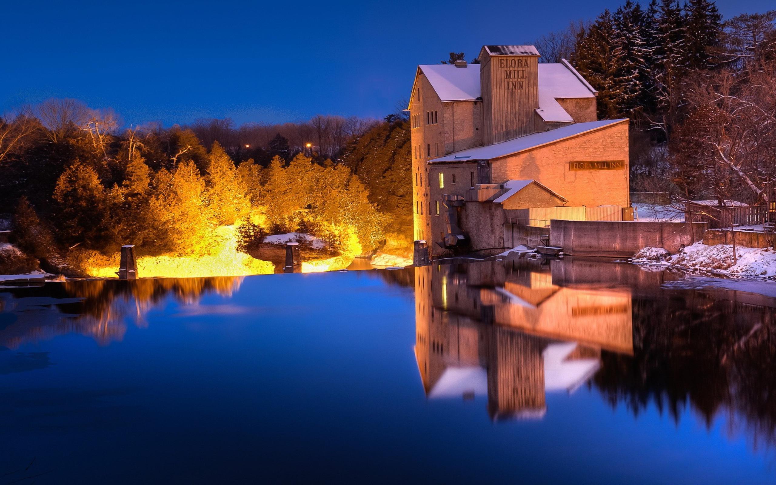 Обои Освещенные деревья на берегу озера