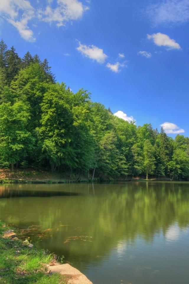 Обои Густой лес на берегу озера