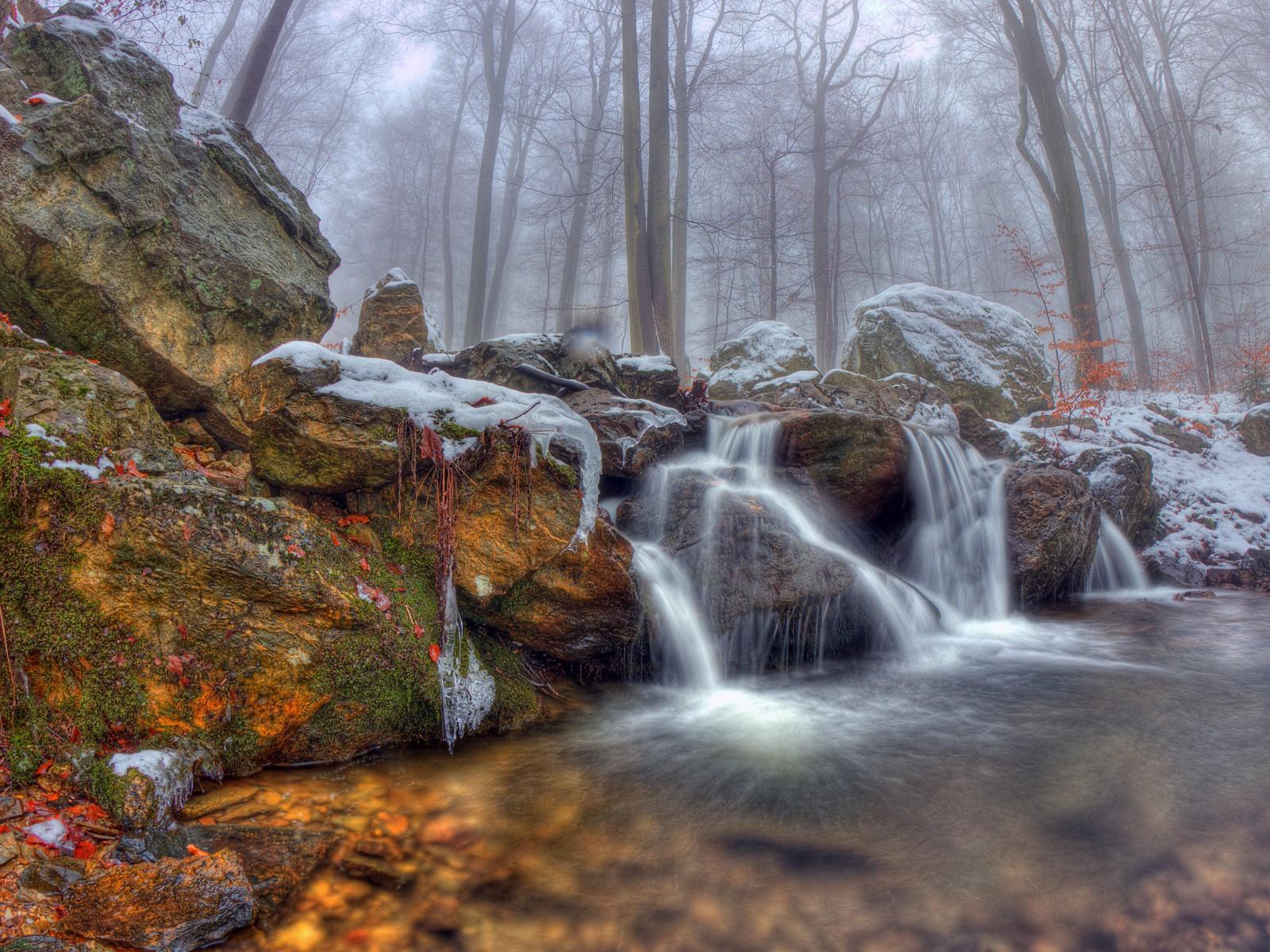 Обои Водопад на фоне туманного леса