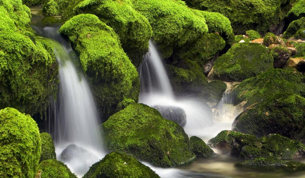 Обои Вода стекает вниз среди поросших мхом камней