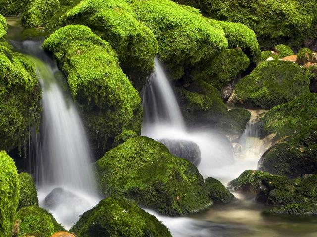 Обои Вода стекает вниз среди поросших мхом камней