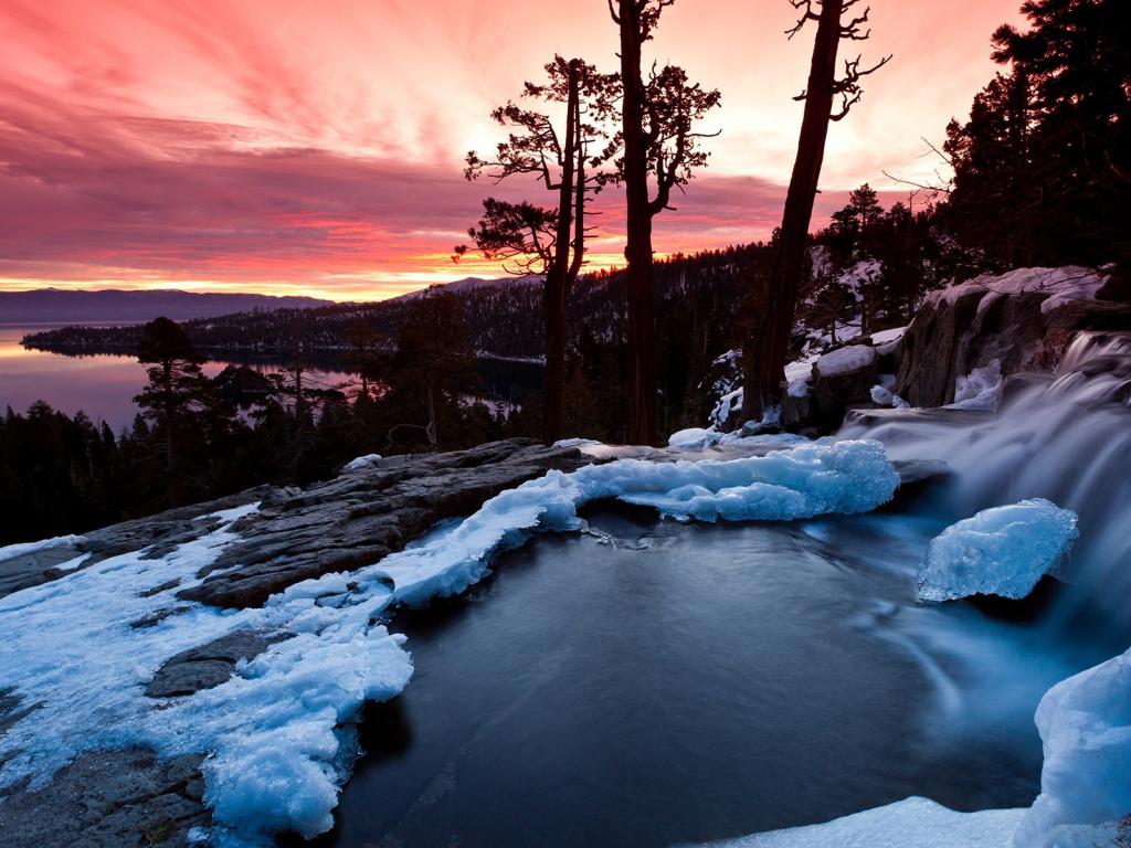 Обои Водопад во льду на фоне заката