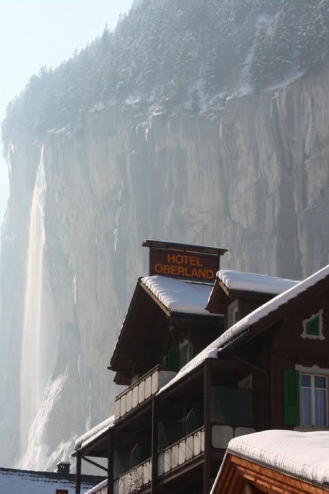 Обои Отель на фоне замерзшего водопада