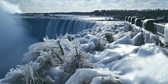 Обои Обледеневшие растения на фоне замерзшего водопада