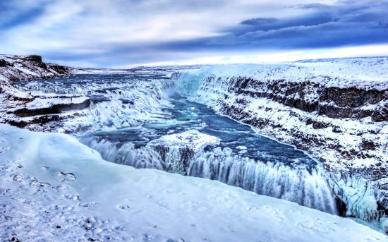 Обои Замерзший водопад среди горных вершин
