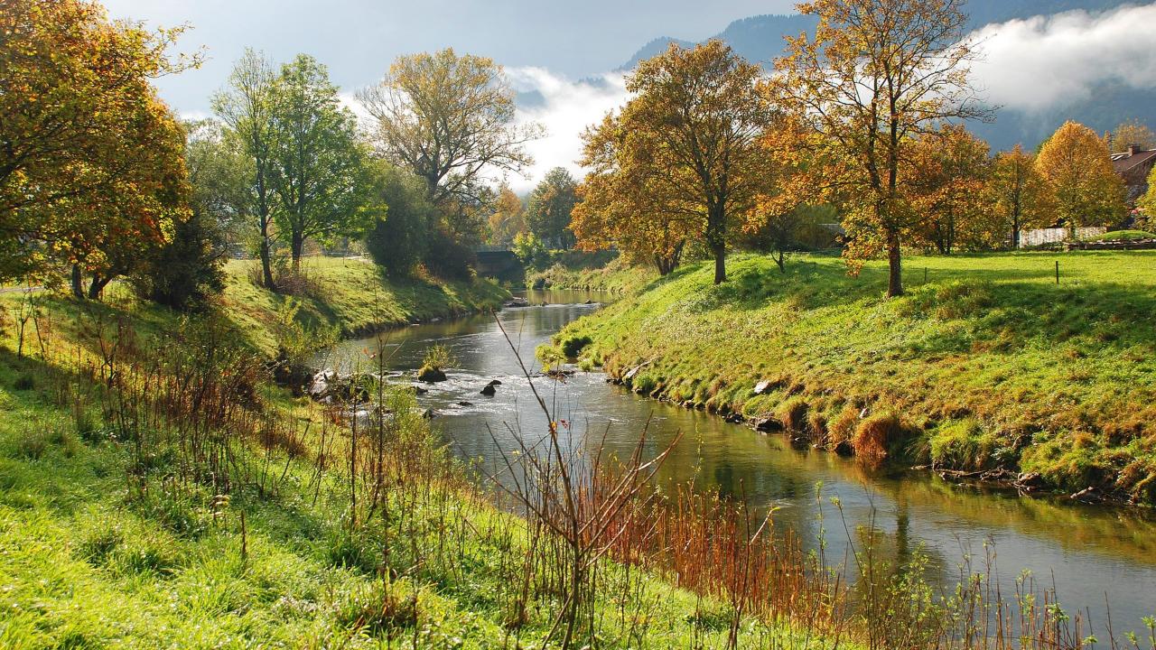 Обои Река с мостом среди зелени