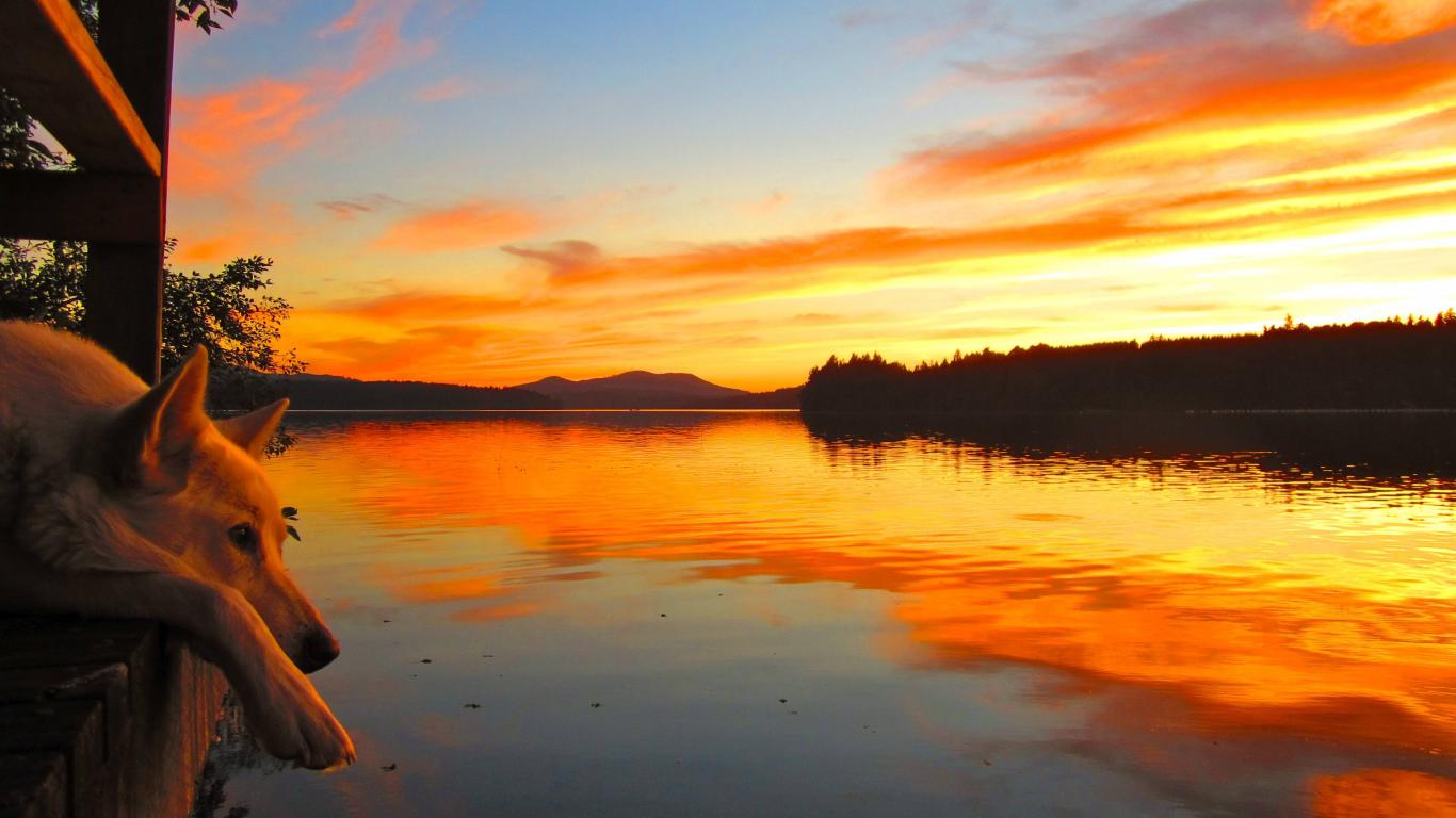 Обои Собака смотрит на закат летним вечером