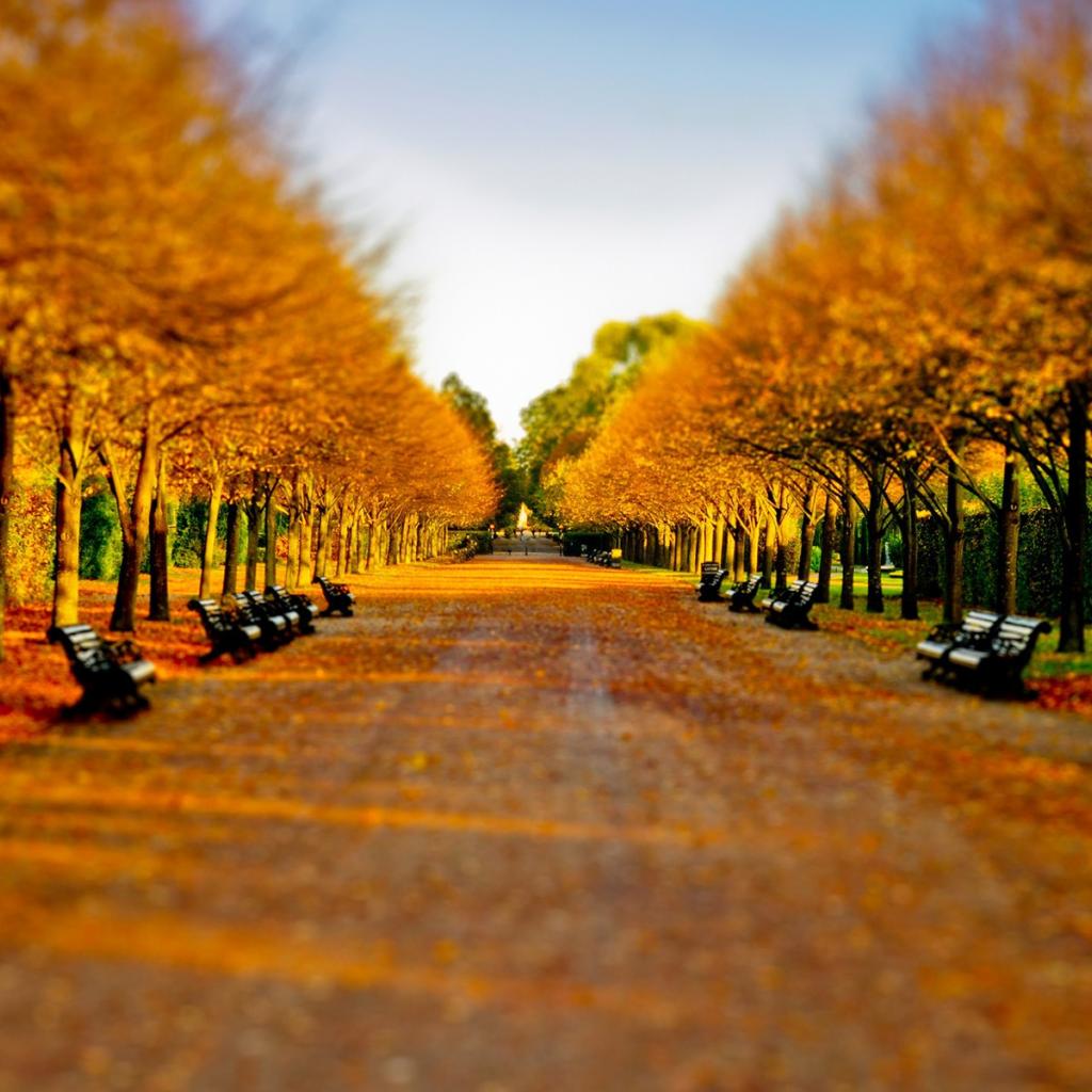 Обои Черные скамьи на усыпанной желтыми листьями аллее