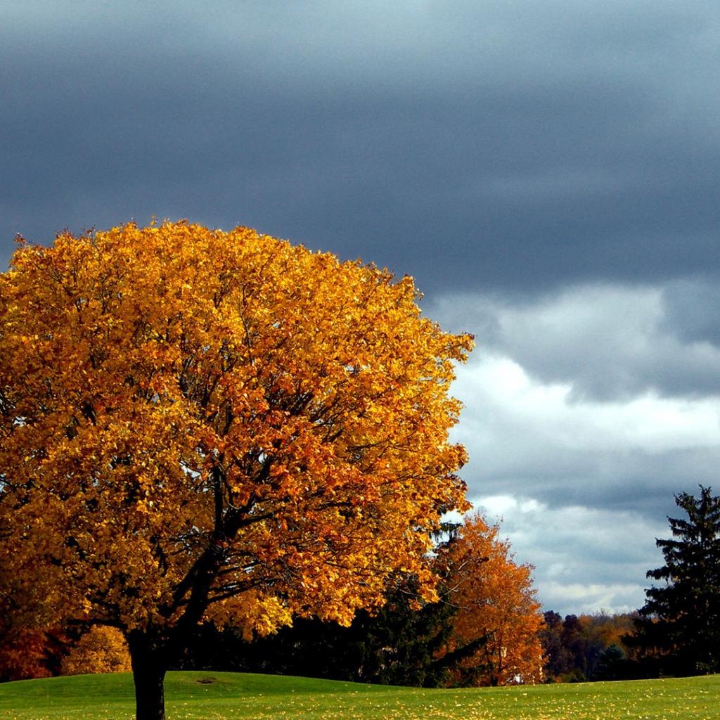 Обои Отдельное осеннее дерево на лужайке в парке