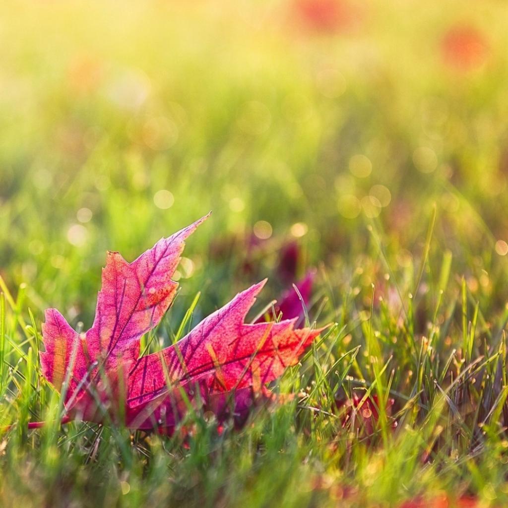 Обои Красный осенний лист в зеленой траве газона