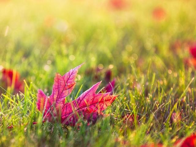 Обои Красный осенний лист в зеленой траве газона