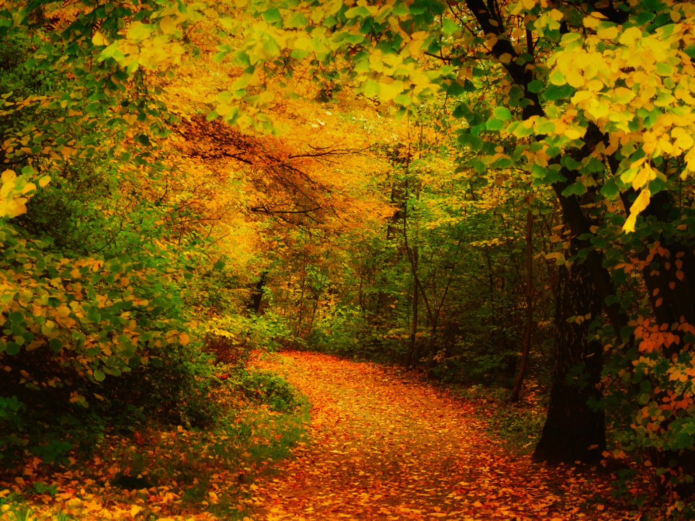 Обои Дорога засыпана желтыми листьями