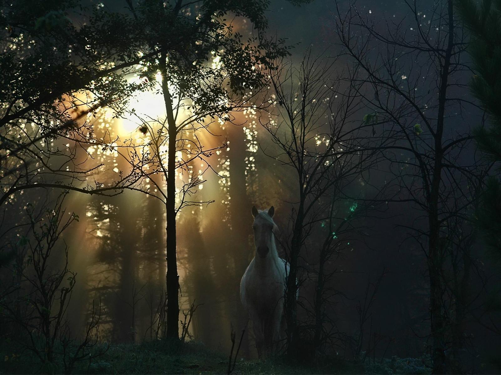 Обои Белая лошадь в осеннем лесу