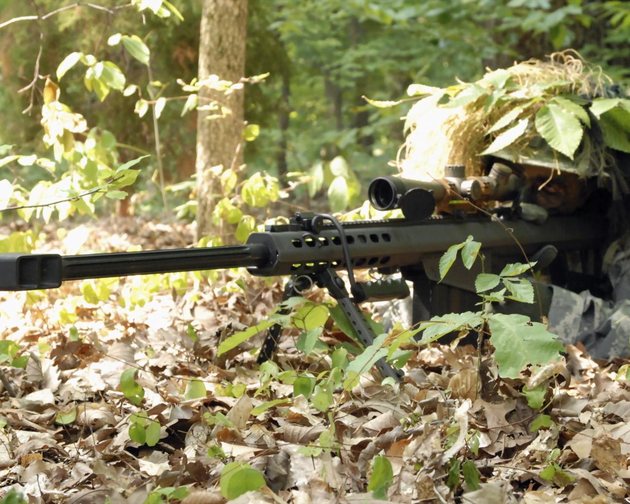 Обои Снайпер под осенними листьями