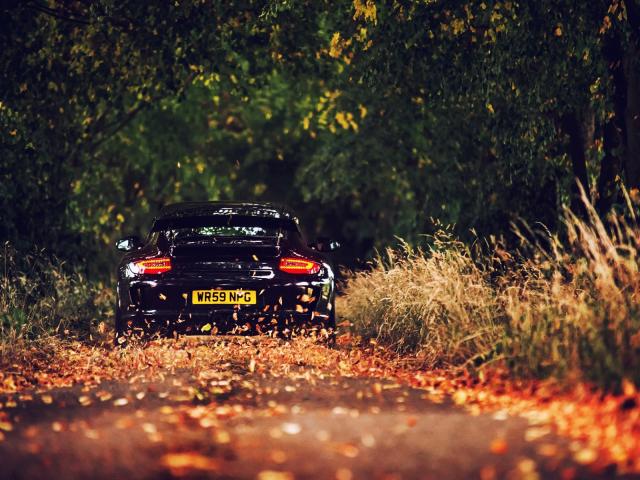 Обои Автомобиль едет на осенней дороге