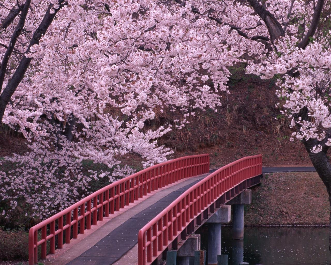 Обои Мост через реку в цветущем саду