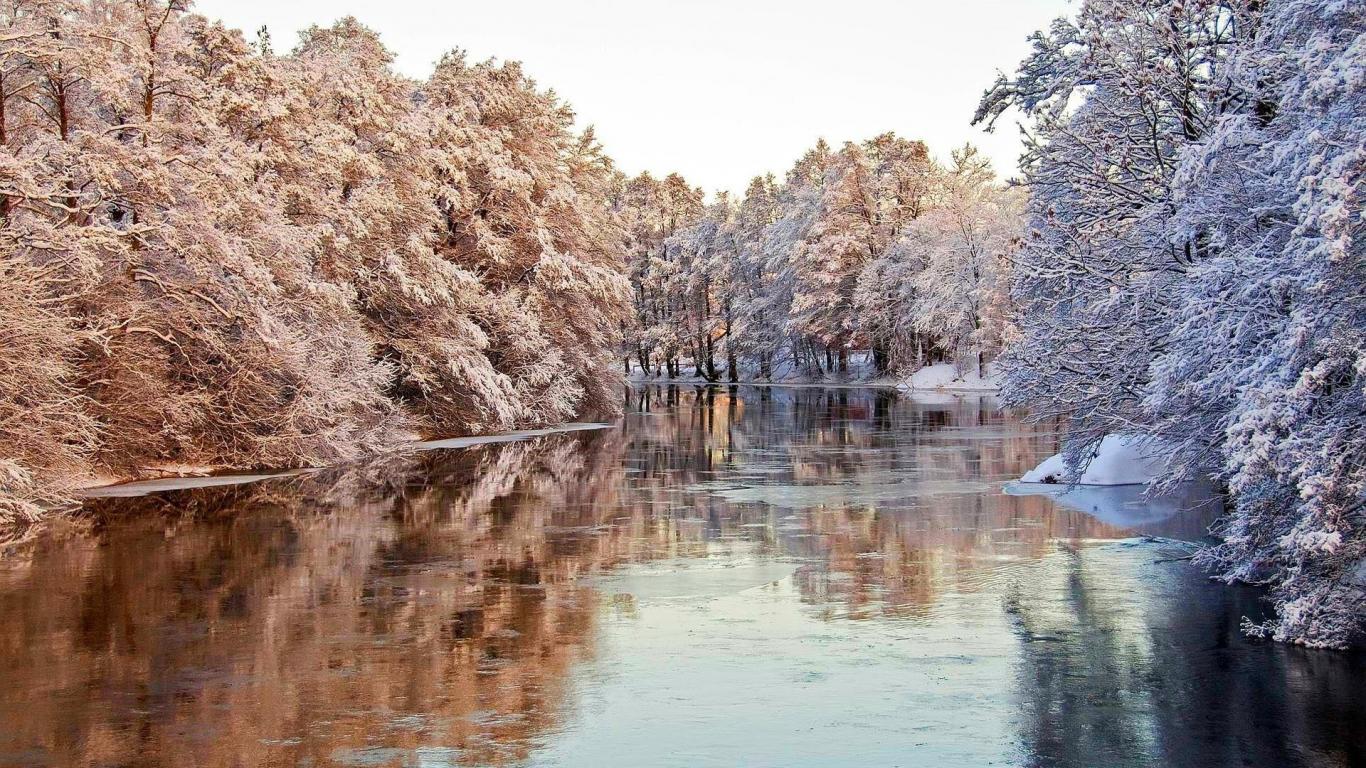 Обои Покрытые инеем деревья над водой реки