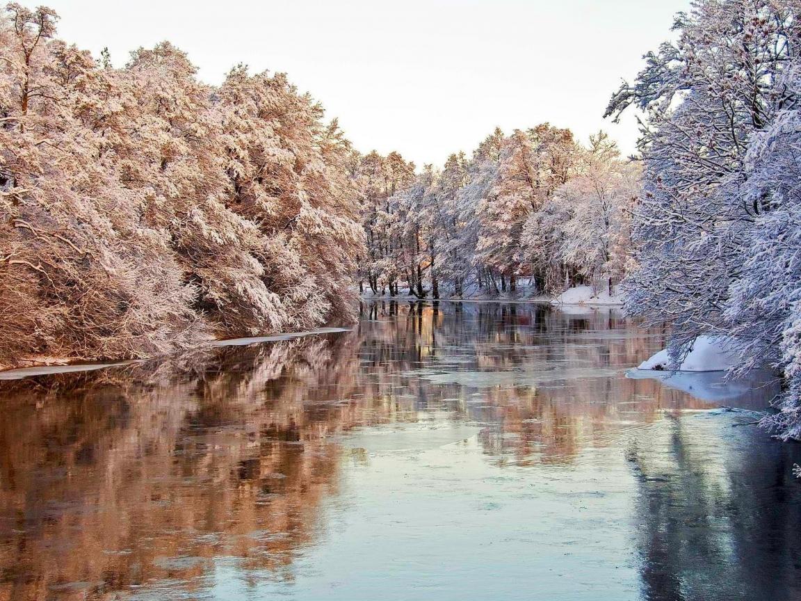 Обои Покрытые инеем деревья над водой реки
