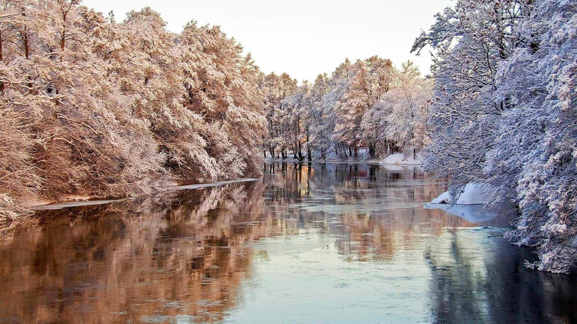 Обои Покрытые инеем деревья над водой реки