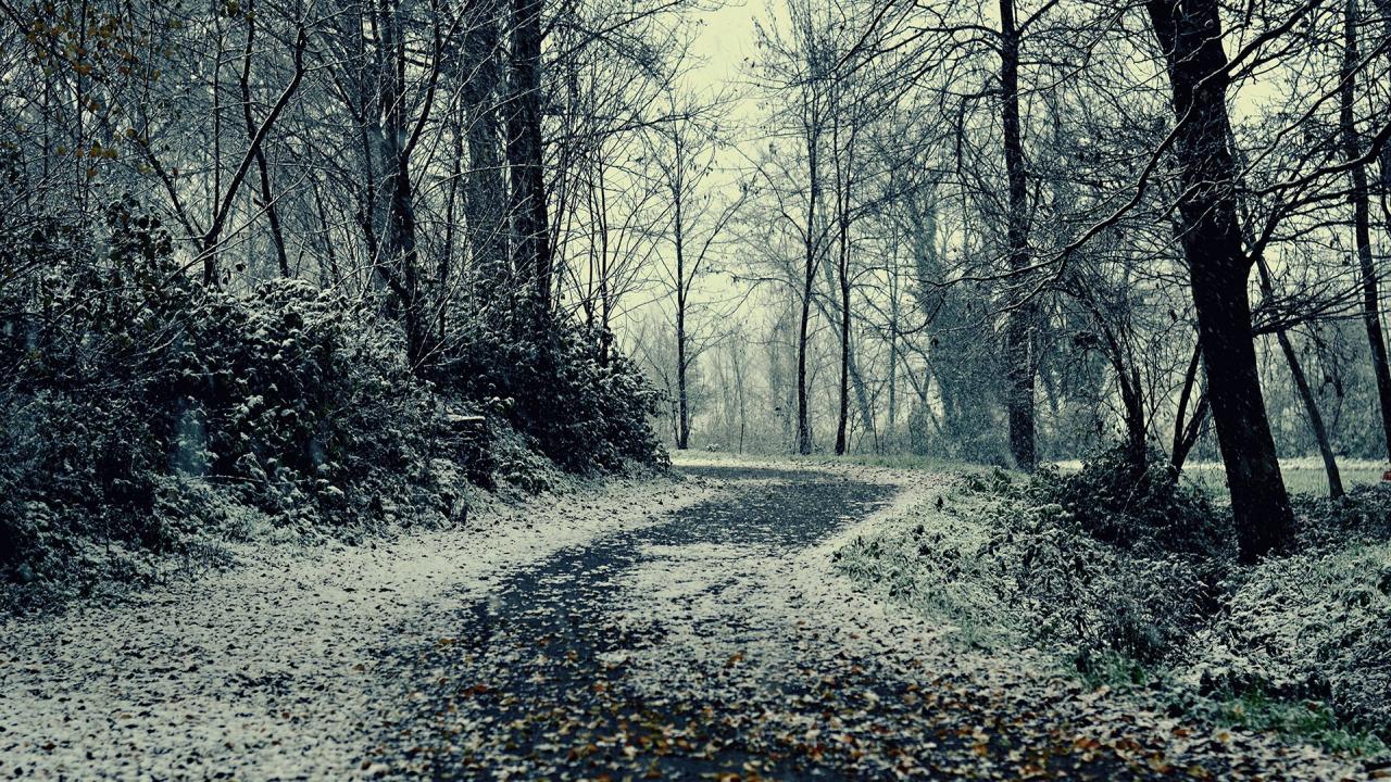 Обои Снег припорошил опавшие листья на аллее