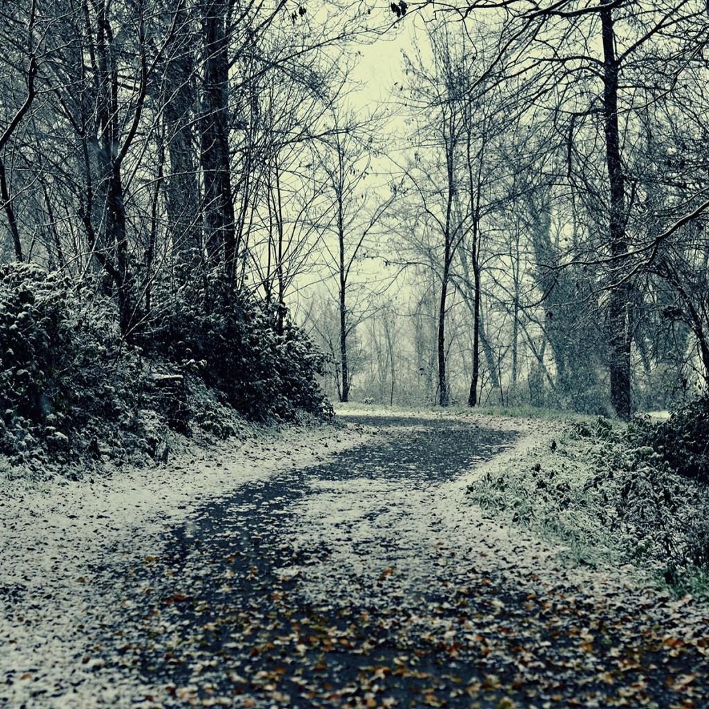 Обои Снег припорошил опавшие листья на аллее